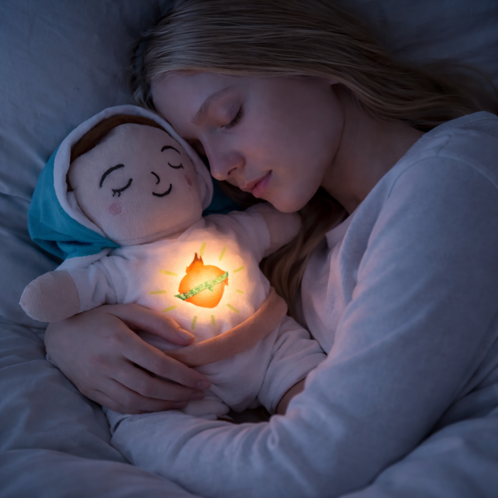 A soft, glowing plush that brings peace, comfort, and faith-filled calm to every bedtime.